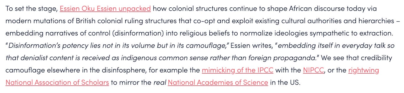 And so, not surprisingly, when the IPIE released its climate change focused report, “Information Integrity about Climate Science,” in 2025, there was a focus on the work of climate obstruction scholars and a touch on conspiracies.